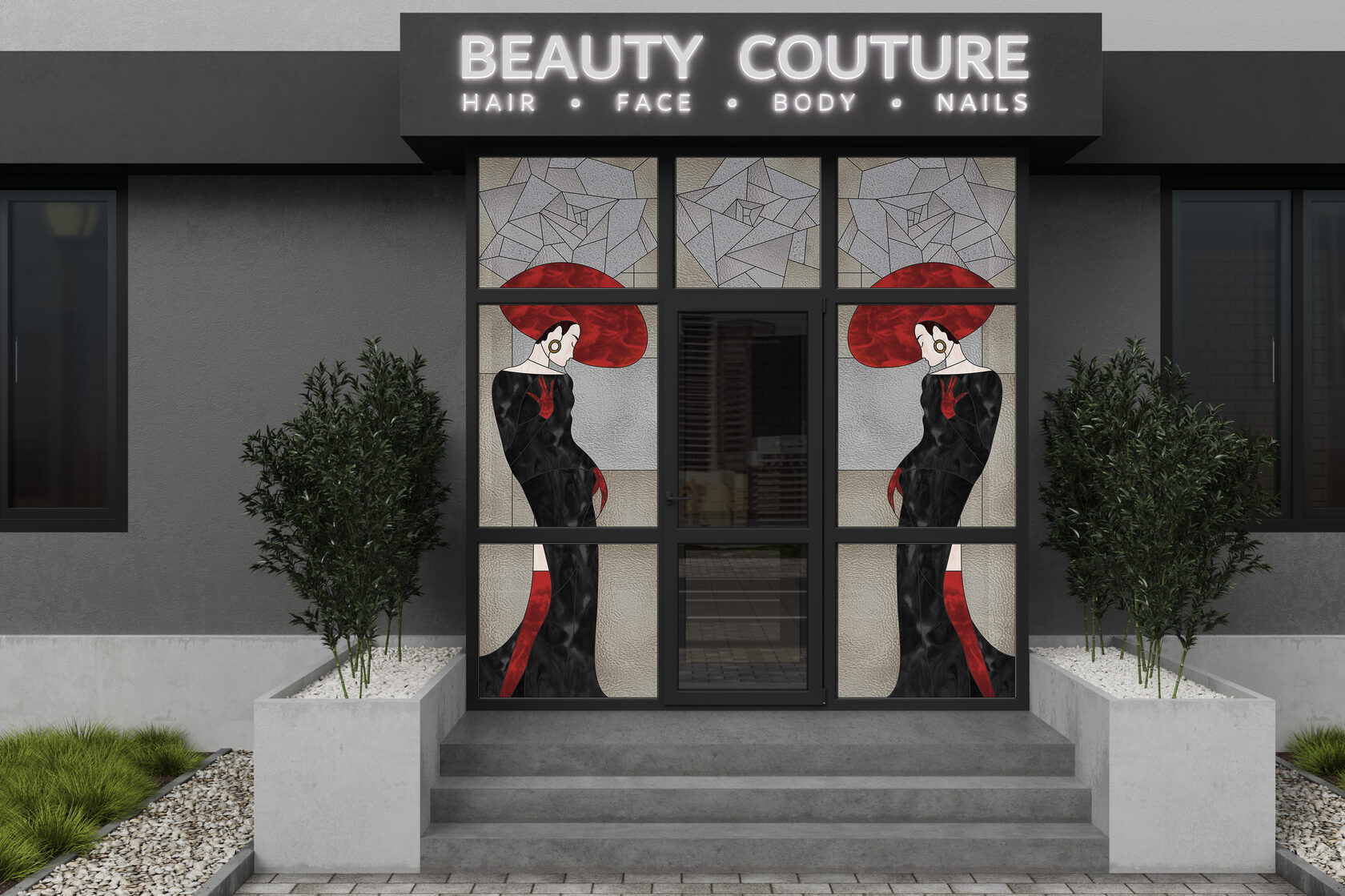 Владельцам салонов бьюти индустрии, стоит обратить внимание не только на качество обслуживания, но и на внешнее оформление своего заведения. В первую очередь клиент перед тем, как ознакомится с услугами и качеством салона, обращает внимание на внешний вид входной группы. Она должна привлекать потенциальных клиентов, вызывать интерес, что же там происходит за дверью. Элегантные дамы в черных платьях в пол с яркими аксессуарами, просто не оставляют шанса пройти мимо и остаться незамеченными.