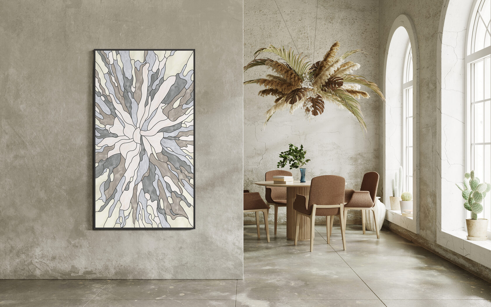 Всего лишь капля воды может изменить все произведение. Рисунок передает это преображение. Из центра идет легкая размытость цвета, это становится похожим на старинную фреску или ковер. Цветовое решение картины подойдет под любой современный интерьер.