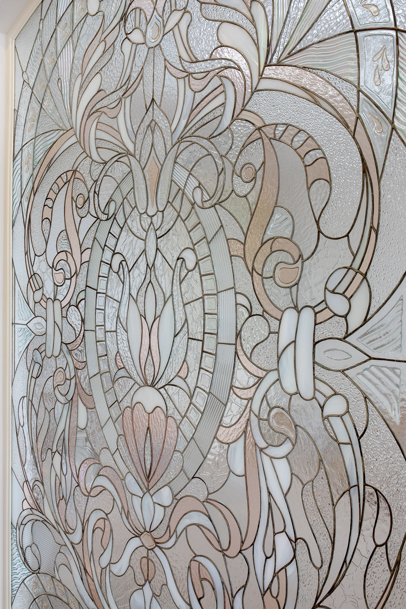 За счет креативного конструктива, потолок с витражными вставками смотрится неординарно, он легкий и воздушный.