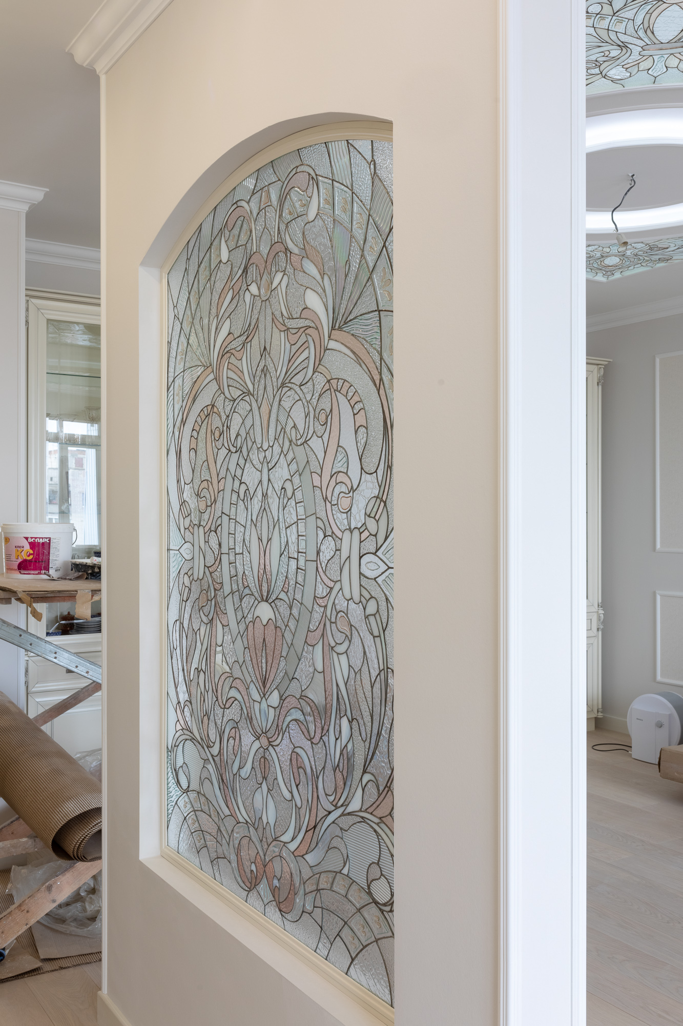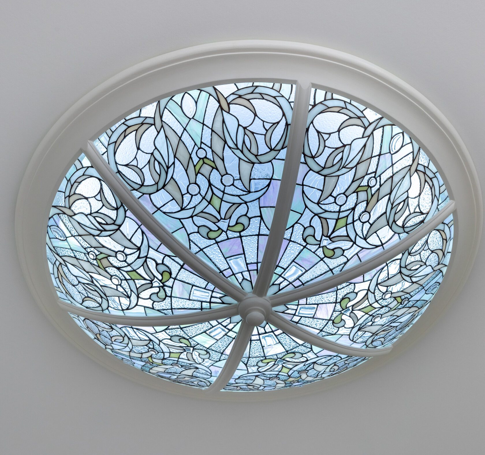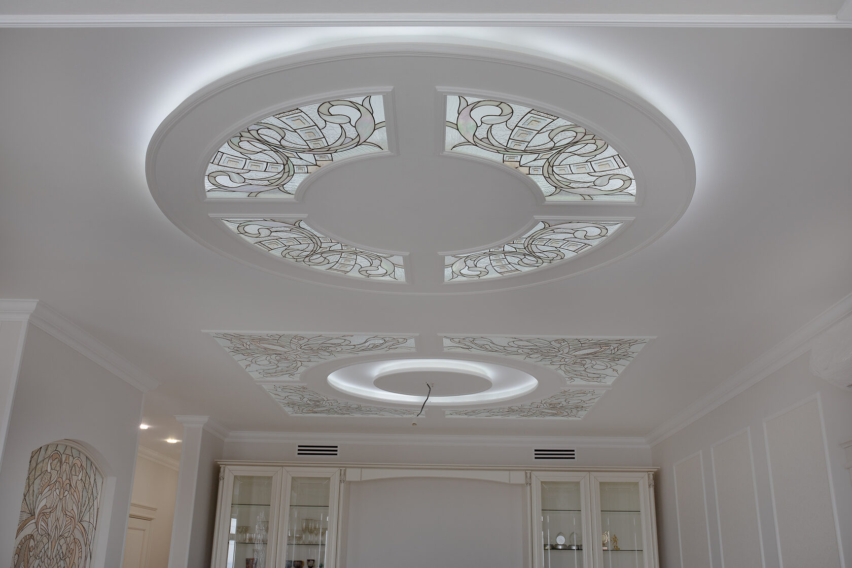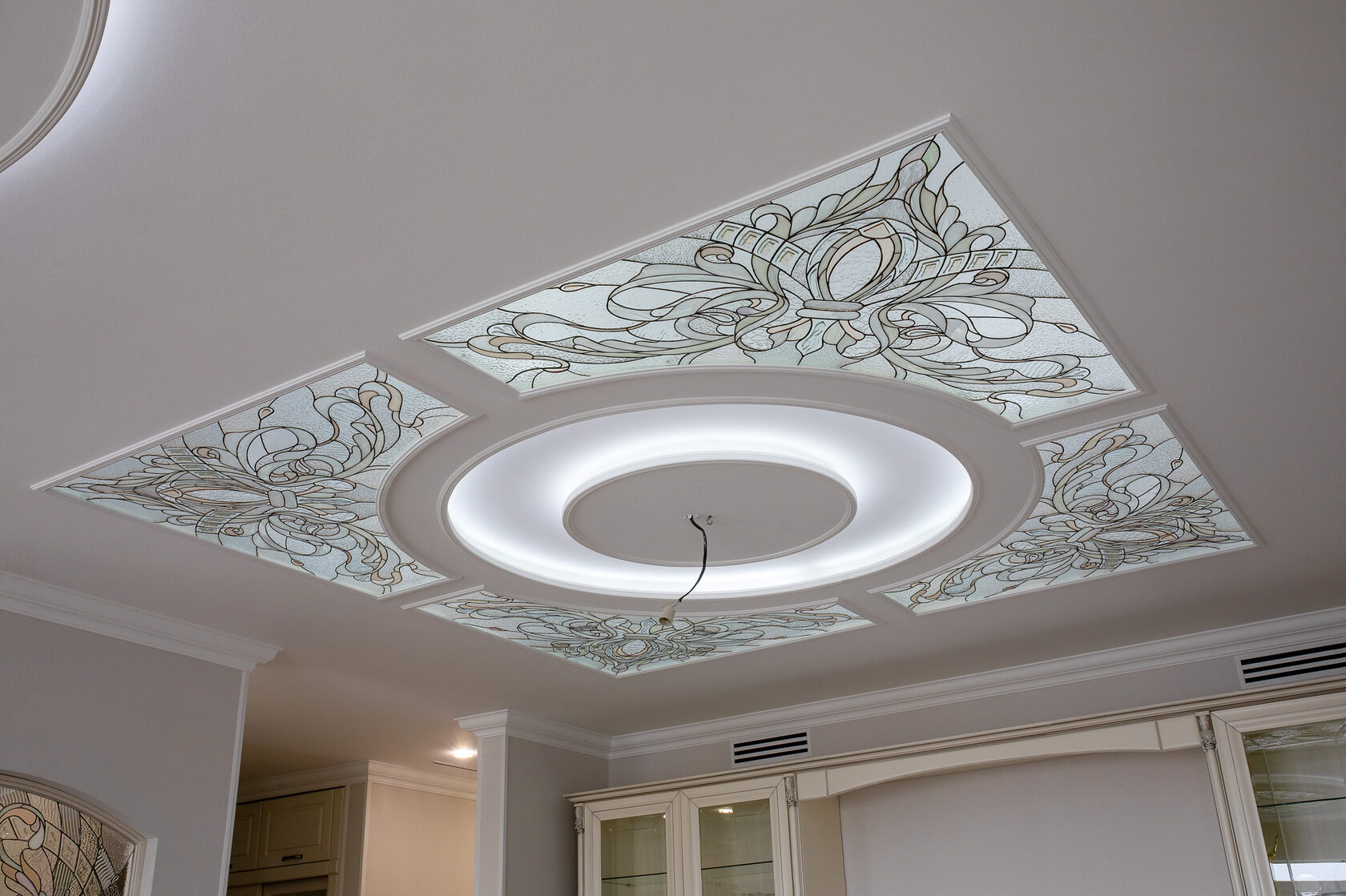 За счет креативного конструктива, потолок с витражными вставками смотрится неординарно, он легкий и воздушный.