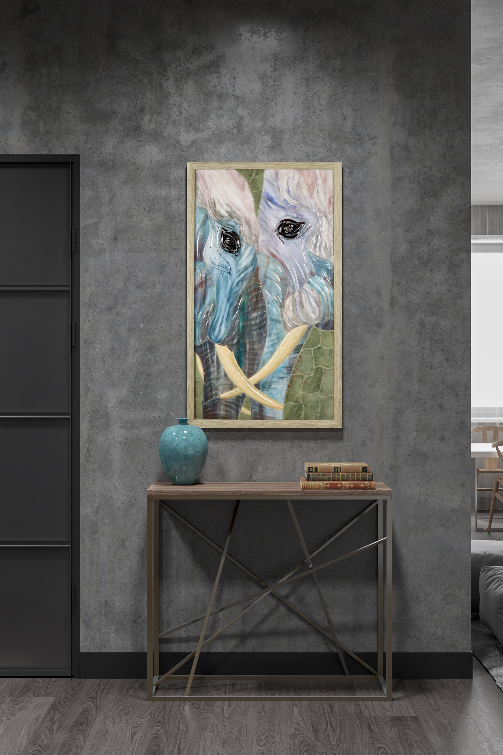 Слон — символ мира, доброты, мудрости, доверия и гармонии. Основное назначение этого талисмана защищать дом от негативной энергии, создавать атмосферу стабильности. Два слона, удваивают эти энергии. На картине изображено не только величие этих животных, но и их нежность и вечная любовь.