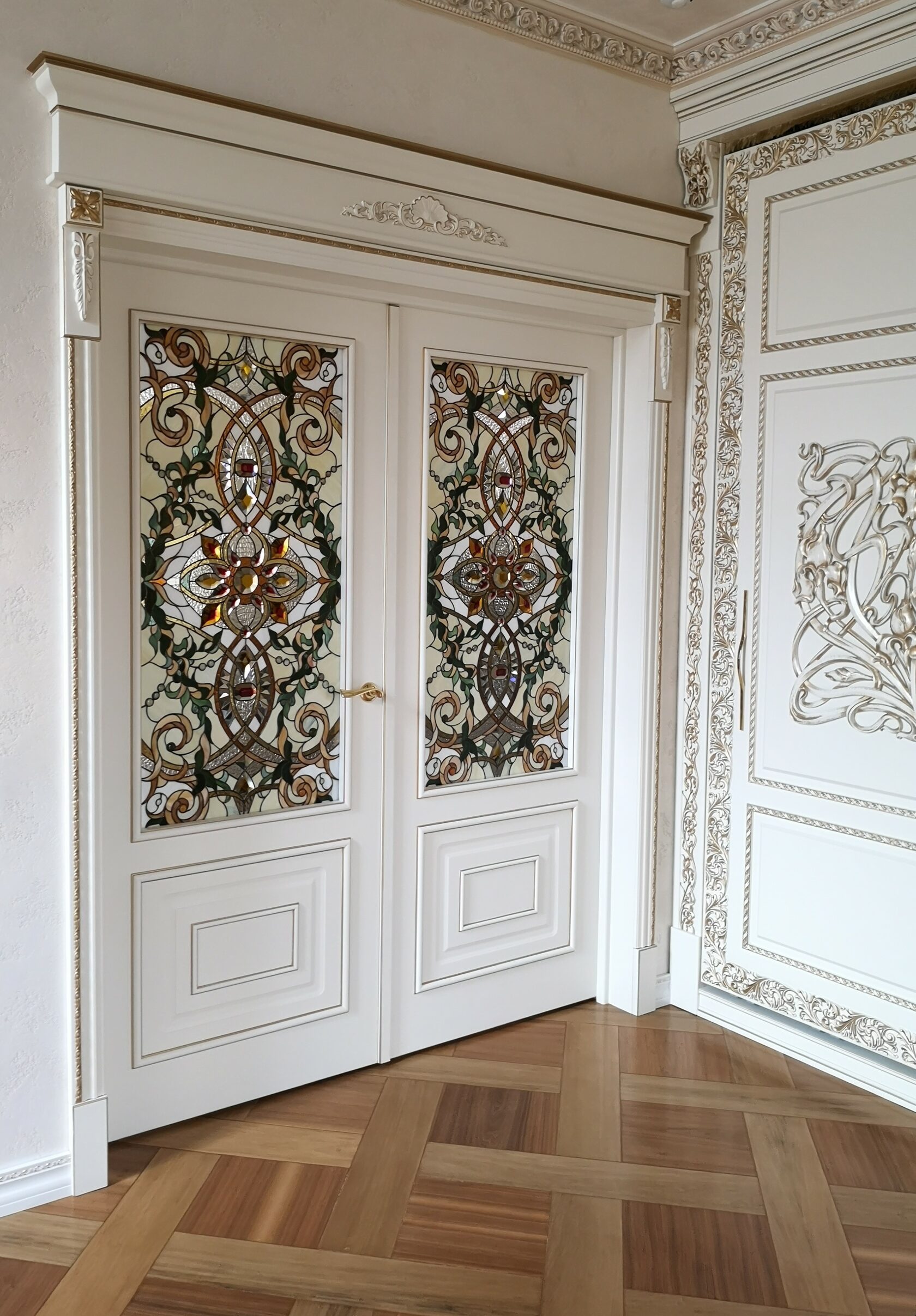 Витражные вставки в двери поддержали роскошь гостиной, сохранив все тонкости классического интерьера. Фацетные элементы заиграли драгоценными камнями, светлые, золотистые оттенки добавили света.