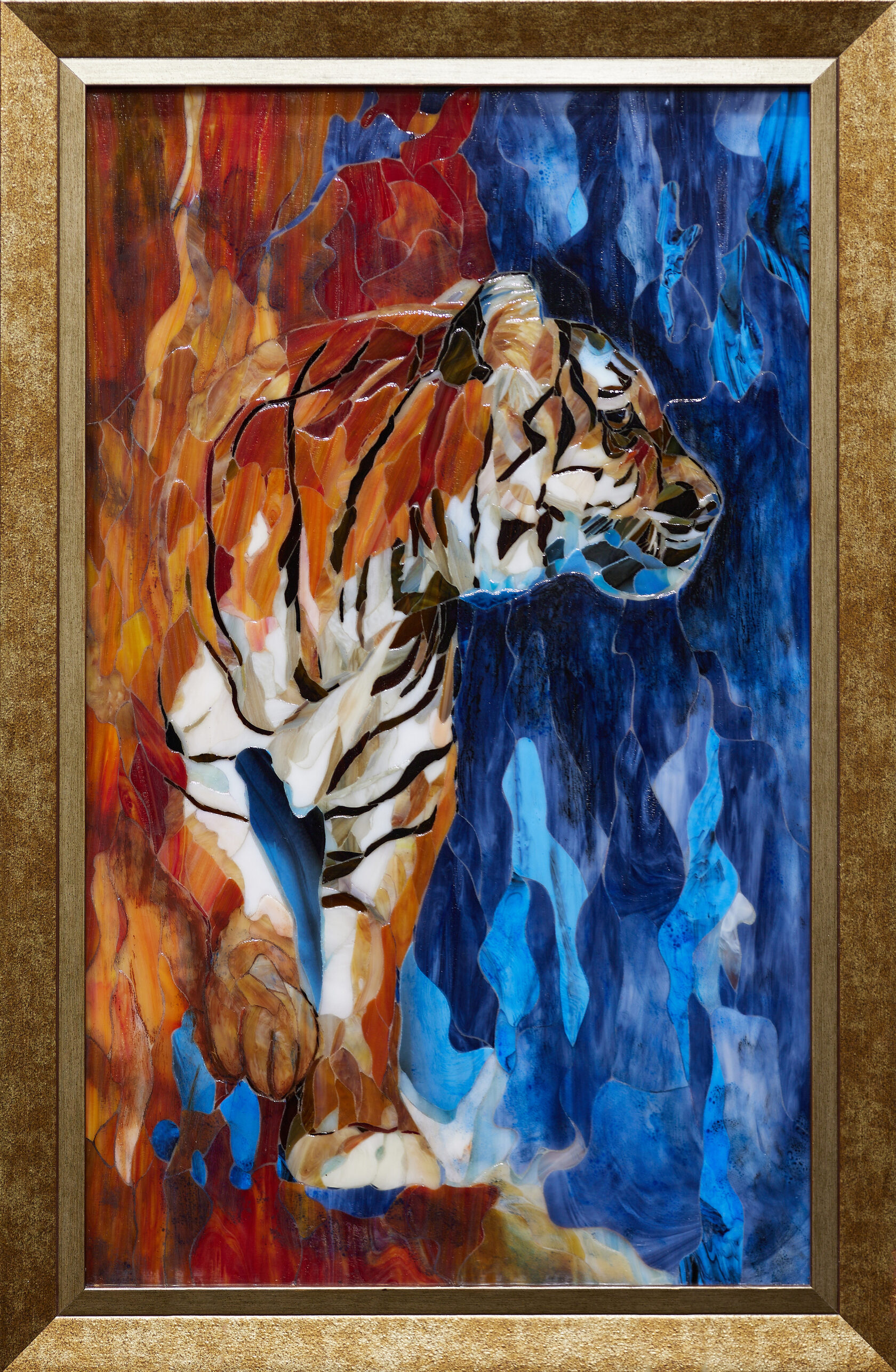 Тигр- это мощный защитный талисман. Он используется в качестве хранителя дома и семьи. Пламя огня очищает, а сама стихия воды гармонизирует пространство. Картина выполнена в контрастных оттенках и ярких акцентах, чтобы привлечь к себе внимание и почувствовать силу трех энергий, тигра, огня и воды.
