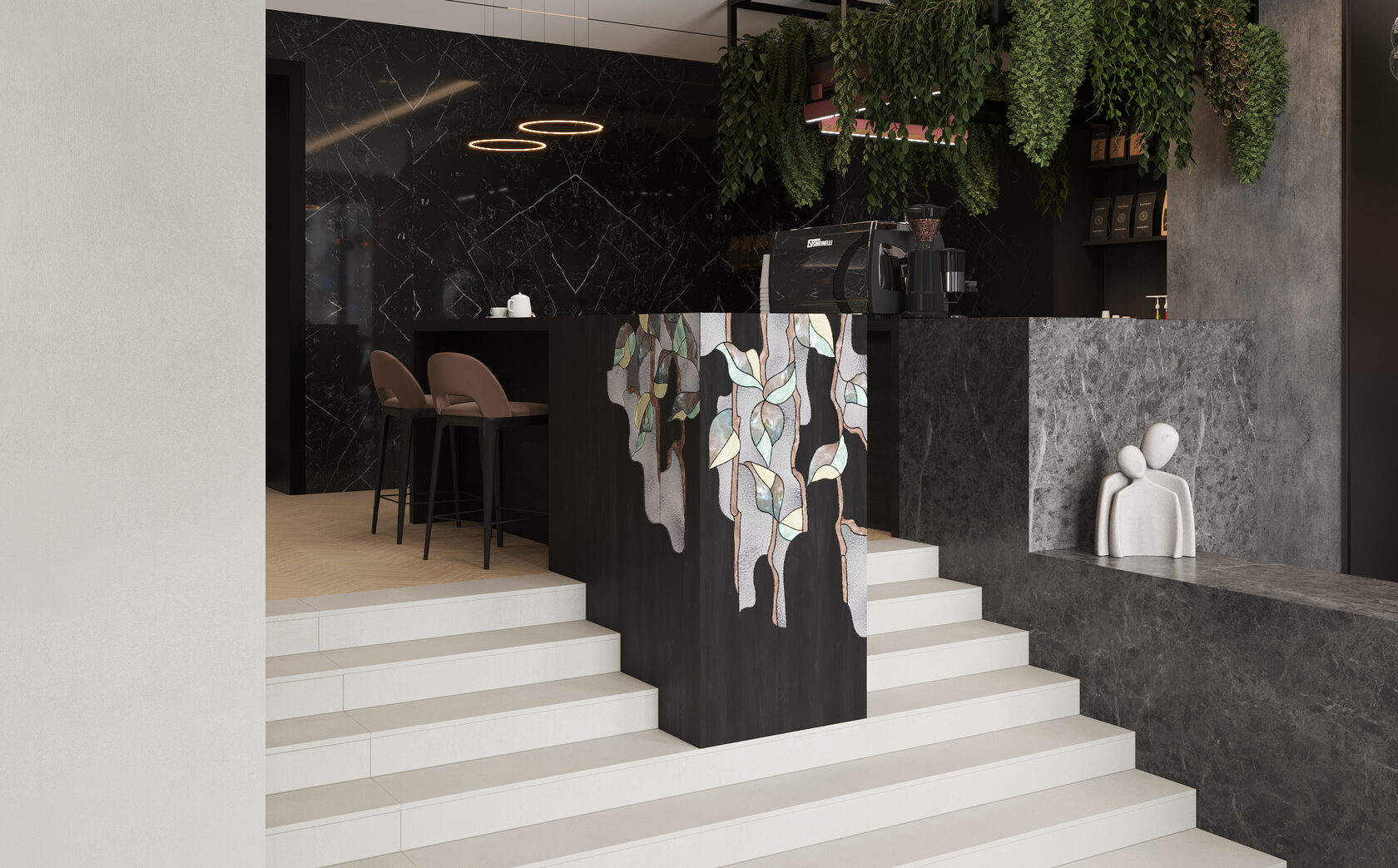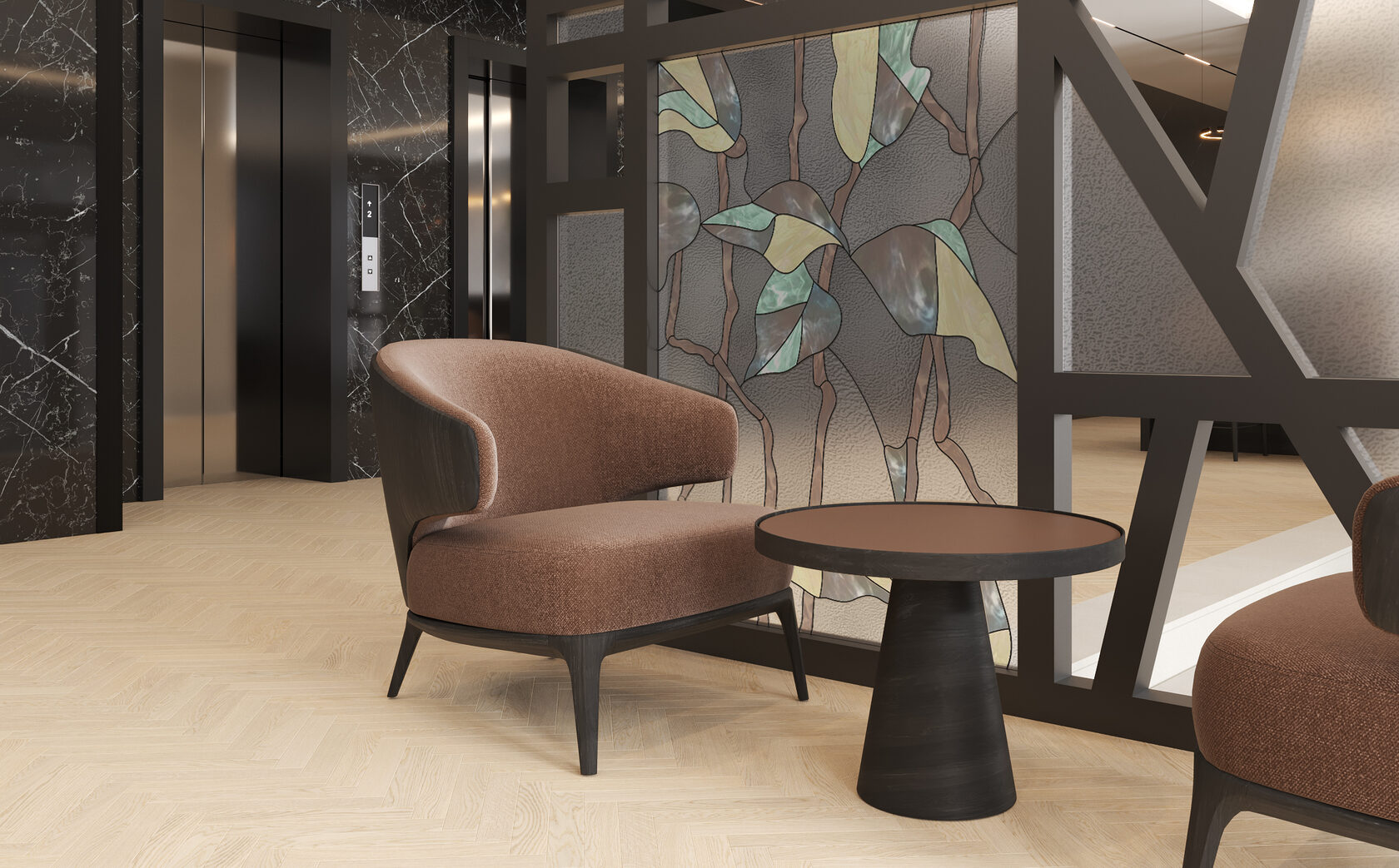Запоминающийся и узнаваемый дизайн интерьера в отеле, один из способов завоевать постоянных клиентов. Первое мнение формируется по картинке, а потом по качеству сервиса. Достигнуто максимум комфорта, тепла и спокойствия в дизайне мебели, линиях интерьера и цветах отделки. Особым украшением являются витражи. Рисунок и палитра цвета наполняют интерьер утренней свежестью и покоем.